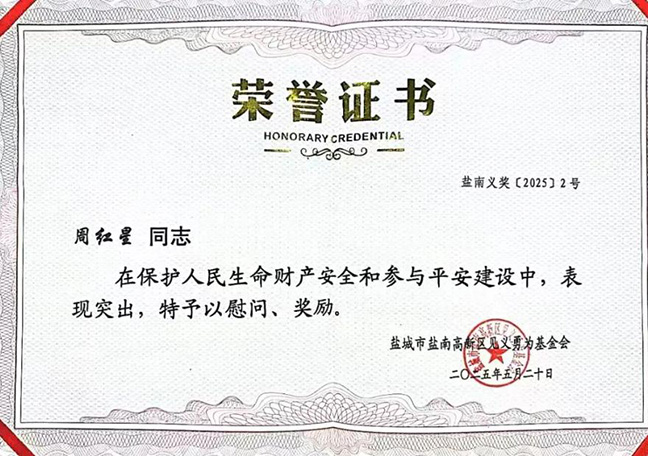目前,鹽城市鹽南高新區(qū)見義勇為基金會(huì)已向周紅星頒發(fā)榮譽(yù)證書,表彰其在危急時(shí)刻挺身而出的助人行為。